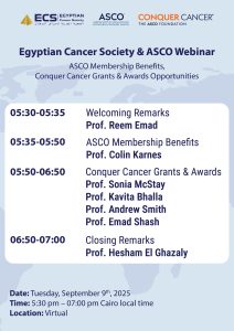In the framework of cooperation between the Egyptian Cancer Society and the American Society of Clinical Oncology (ASCO), we are pleased to announce our first joint webinar: