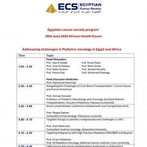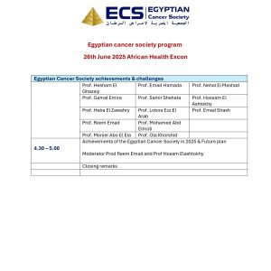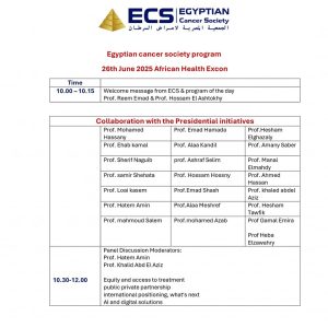 We are pleased to share with you the agenda for the Scientific Day, in which the Egyptian Cancer Society will participate on Thursday, June 26th, as part of the annual African Health Conference.